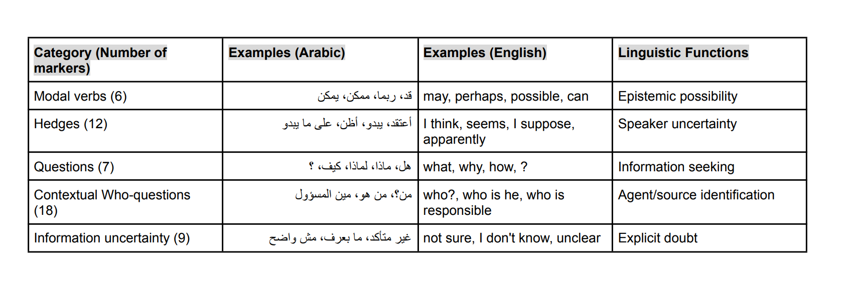 The classifier identifies several categories of linguistic uncertainty markers in Arabic discourse, summarized in Table 1 below: